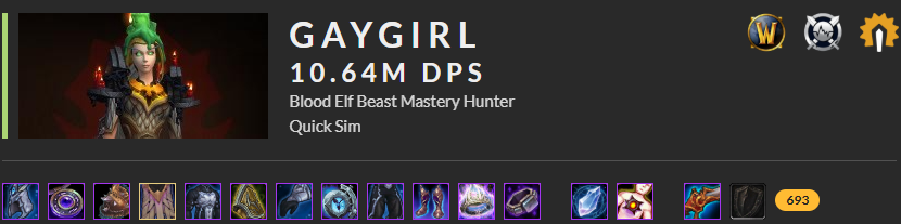 I noticed your running deathblow for more kill shots and taking killer instinct over serpentine rhythm, for the ST macro I find running rhythm a noticeable DPS increase in both ST and AoE scenarios, also it makes the macro flow better with lower haste ratings! You want to dump as much stats to gain ~30% haste to make BM PL really shine. Killshot in it’s current state while looks aesthetically pleasing, doesn’t provide a DPS gain over more cobra shots .. but without simming your character, I’m making assumptions. ![]()