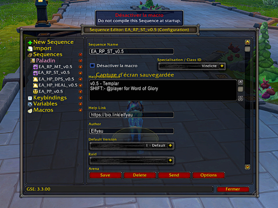 That being said i think it’s important that you know that at least 3 of your macros are currently problematic (warrior/paladin/mage) the problem is that by default it seems that you have activated an option that makes the keybinds not working. On a fresh GSE installation (i deleted the addon and the variables to be sure) and when i activate your macros, when i keybind at first glance your macro works. But if i do anything required a loading screen your macro stop working. I think the problem is on the options of GSE, when i check your macro via the “sequence” button, you can see that by default you checked the option “desactivate macro” (do not compile this sequence on startup) wich make your macro unusable at least for me. I had to uncheck this option, and once i did everything was perfect, like it was before the pre patch update. Just wanted to let you know, i never touched anything on your macros for months, only keybind once and everything was perfect. So maybe an error on your end ? Again, thanks for your work !