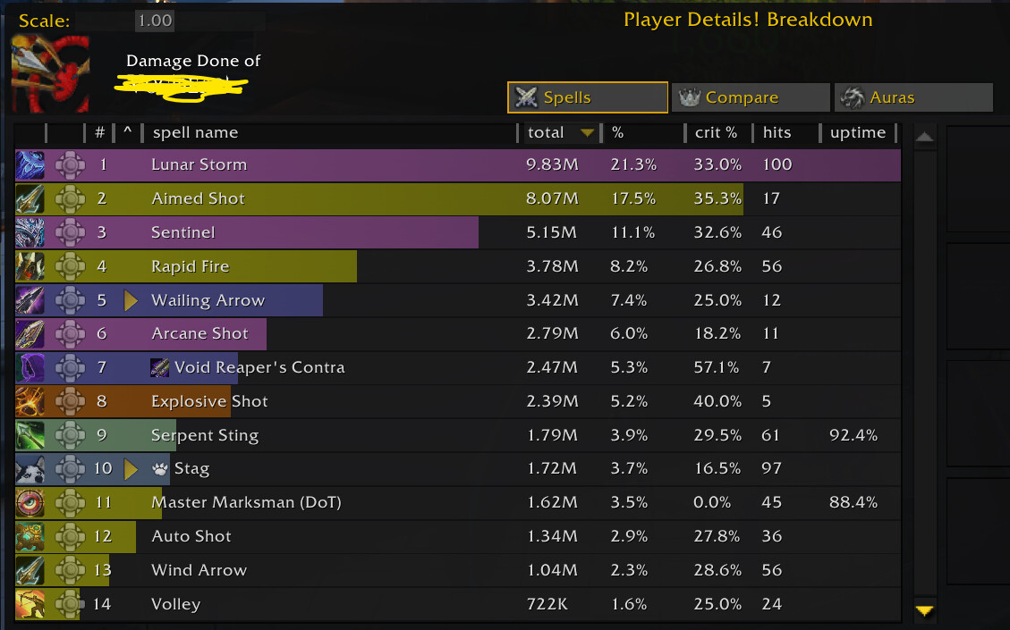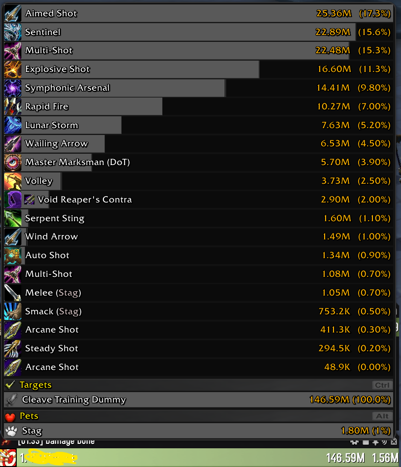 Iām currently testing your macro as I seen this site last night and installed everything, with my Dark ranger MM build for both single and AOE the build is working 90% flawlessly, that last 10% is an issue iām seeing in the rotation involving when Black Arrow activates based off a Death Blow proc, and the macro actively ignores Black Arrow instead of immediately using the ability as itās active, I am currently manually popping it when it procs as I can get 3 to 6 black arrows in a row (with extreme luck) and if it was activating in the macro properly Iād be pulling 950,000 DPS matching my simulation dps score but as itās not activating black arrow Iām running 100k less than sims. Which is still amazing.