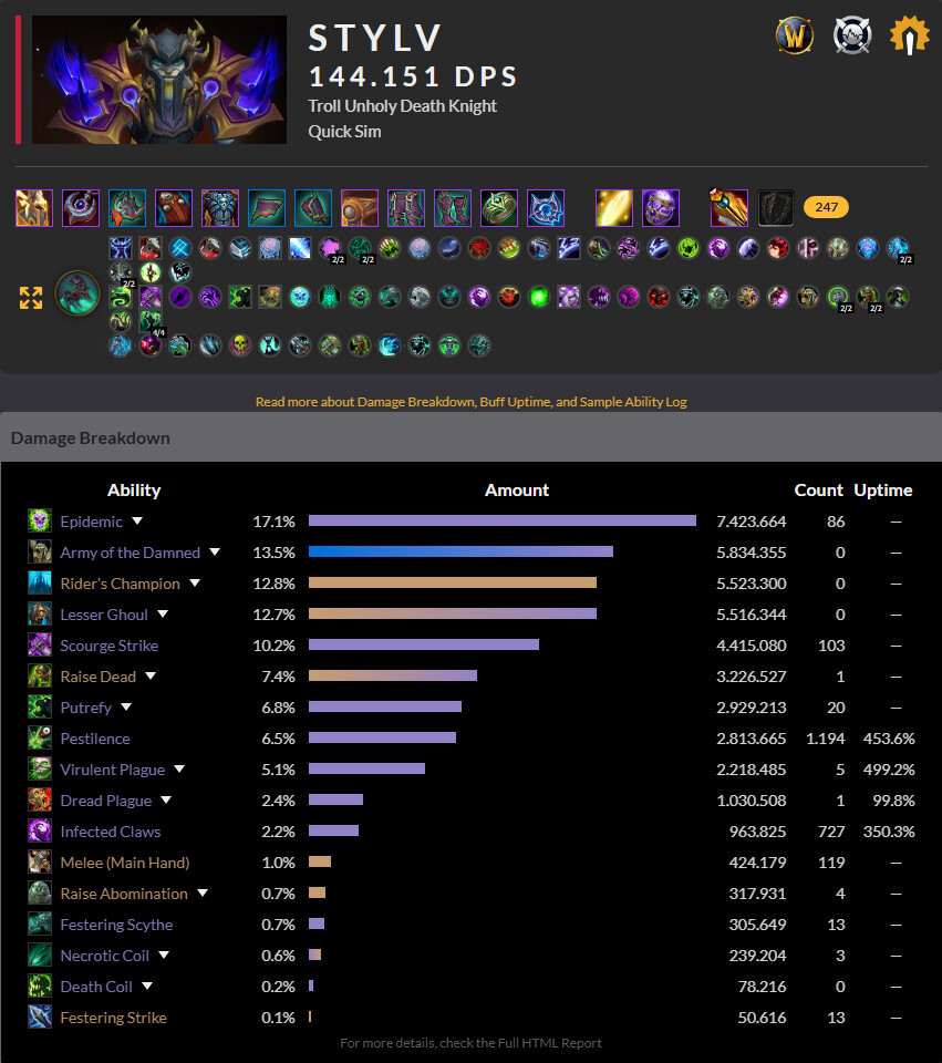 I’m playing an Unholy DK at 251 ilvl and gave your single target setup a try on a training dummy with the recommended talents. I ran a 2 minute test comparing it to Blizzard’s one button rotation, and Blizzard’s one button setup ended up performing a bit better.