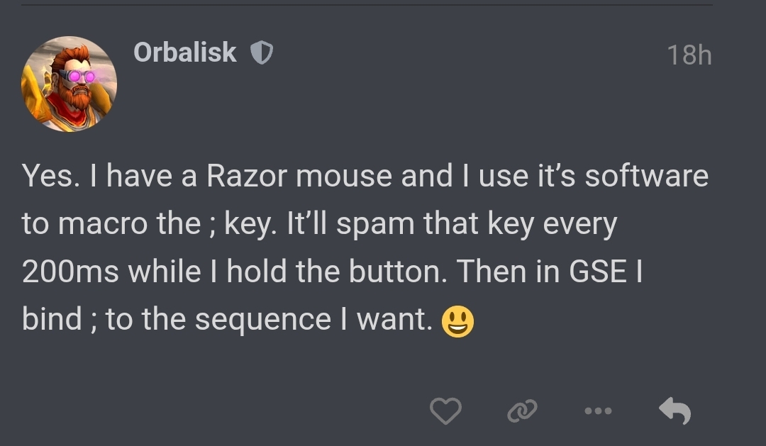 Hi everyone I’m writing here in the Paladin section to give my honest feedback about the current state of Retribution Paladin unfortunately there’s really nothing we can do right now the Ret macro setups are almost completely unusable I’ve tried pretty much every macro posted on the forum and tested all possible settings including different spell queue values OOC mouse pulling and every combination I could think of but nothing works properly there are more dead times than actual skills going off and sometimes the character just stands there like it’s thinking before casting something I’m currently level 90 with item level 230 so it’s not a gearing issue but with GSE macros I’m experiencing around 70/80 % downtime and abilities often fire in a very inconsistent way I know the macro developers are working on fixes and I also understand they have to enjoy the game and focus on the expansion too and I’m sure if there’s a solution they’ll find it this is not meant to be a complaint just honest feedback as of 04/03/2026 I’m posting here because everyone has been helpful especially Orbalisk and Ricore who helped me a lot but sadly right now Retribution Paladin with GSE macro is simply unusable at least in my experience!