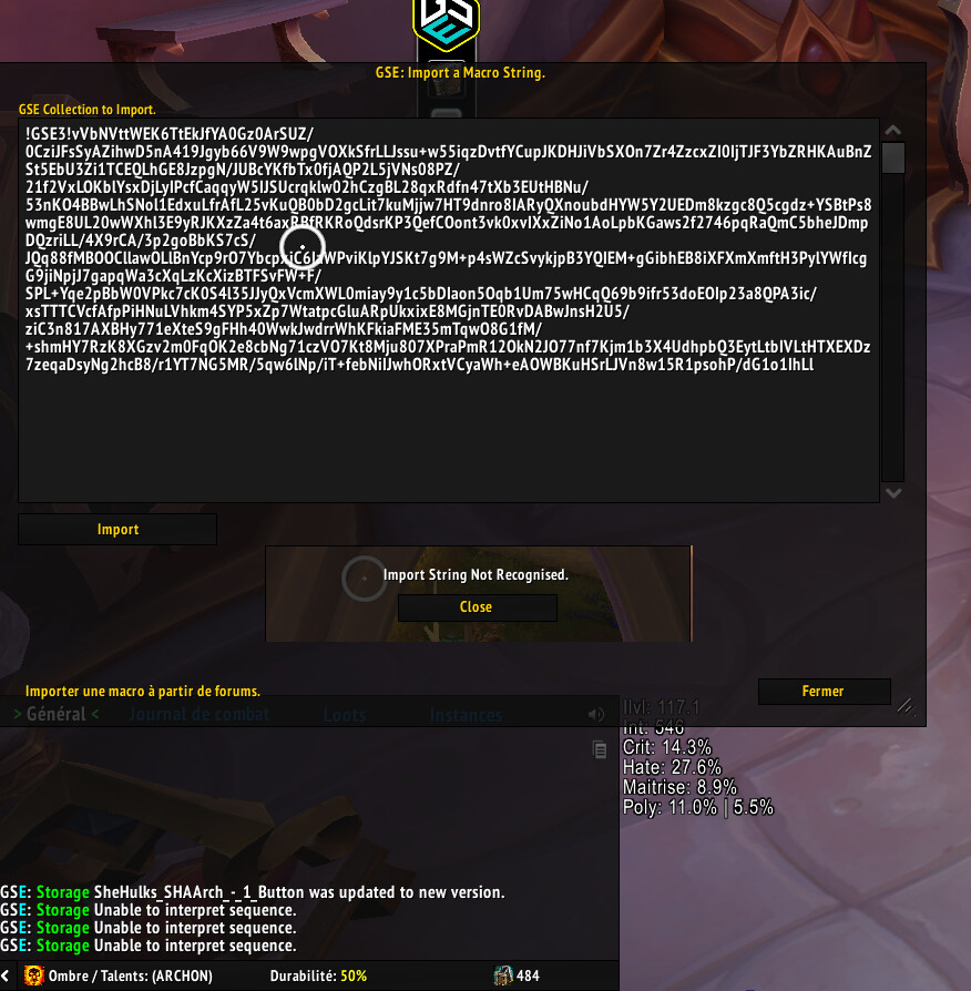 I’m sorry, but when I try to import ‘All in One: SheHulks_SHAVoid_-1_Button’ into GSE, I get an ‘Import String Not Recognised’ error message. Here is the screenshot. This is my first time using GSE. Interestingly, 'All in One: SheHulks_SHAArch-_1_Button’ works perfectly fine for me. I am currently level 81 in the Midnight expansion. Could you please help me with this?