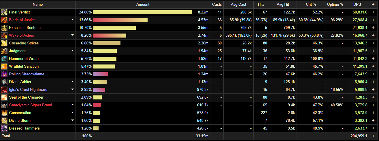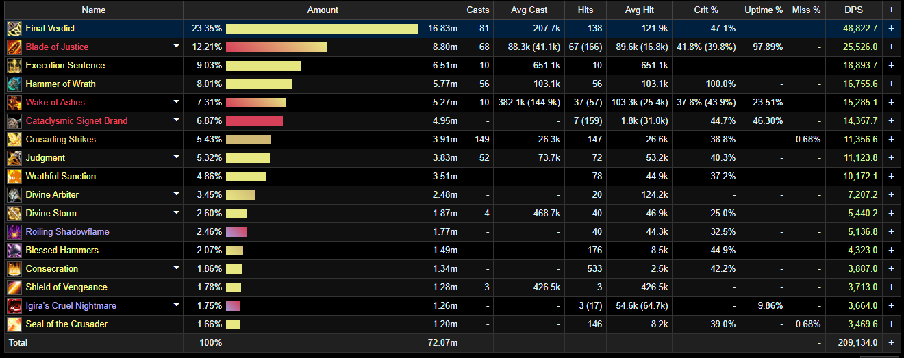I went through the logs of the top 10 ret paladins on igira since its an easy quick boss to test the single target raid.