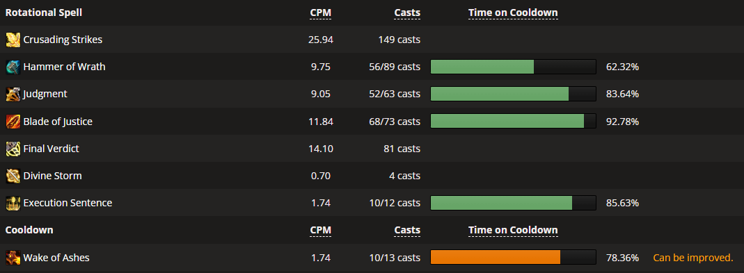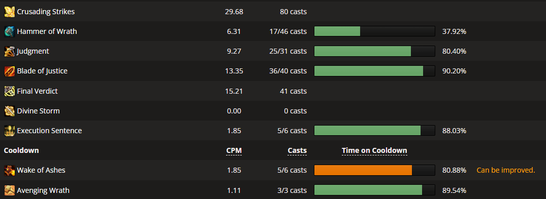 due to the amount of times I ran igira attempting to do the same boss over and over again to see progress I had to run a couple other bosses as I got it figured out as the night was getting late. I jumped in normal doing volcoross and larodar. overall and not ilvl parses show 87 on volcoross and 94 on larodar, you can see the judgment usage and blade of justice usage have both moved into the 80%+ category aligning with some of the top paladins in the world. on volcoross I wasted 12.73% holy power and on larodar 15.25%, by utilizing alt you’ll be able to reduce the waste even more. mine will drop as I get used to the new macro setup into the single digit percentages.